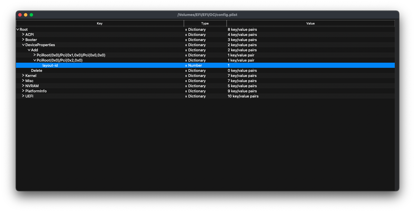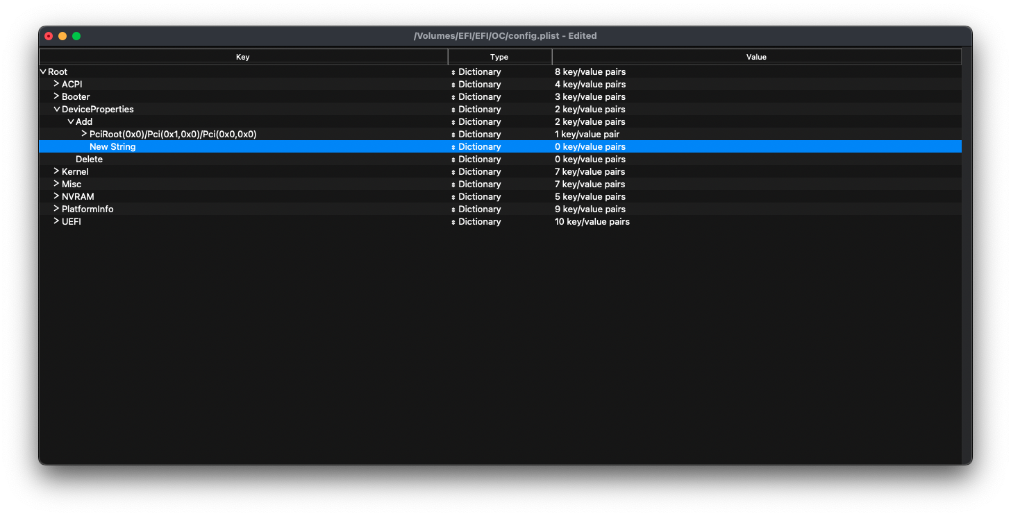 You’ll need to open your OpenCore config.plist in ProperTree. Create a new child under DeviceProperties -> Add. Set its Type to Dictionary.