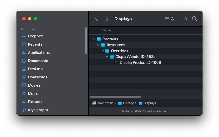 We’ll need to navigate to /Library with Finder or a Terminal, to create a new folder titled “Displays”. With that done, navigate within that folder and proceed to make folders until you get the following path. As far as I know, the path is case-sensitive.